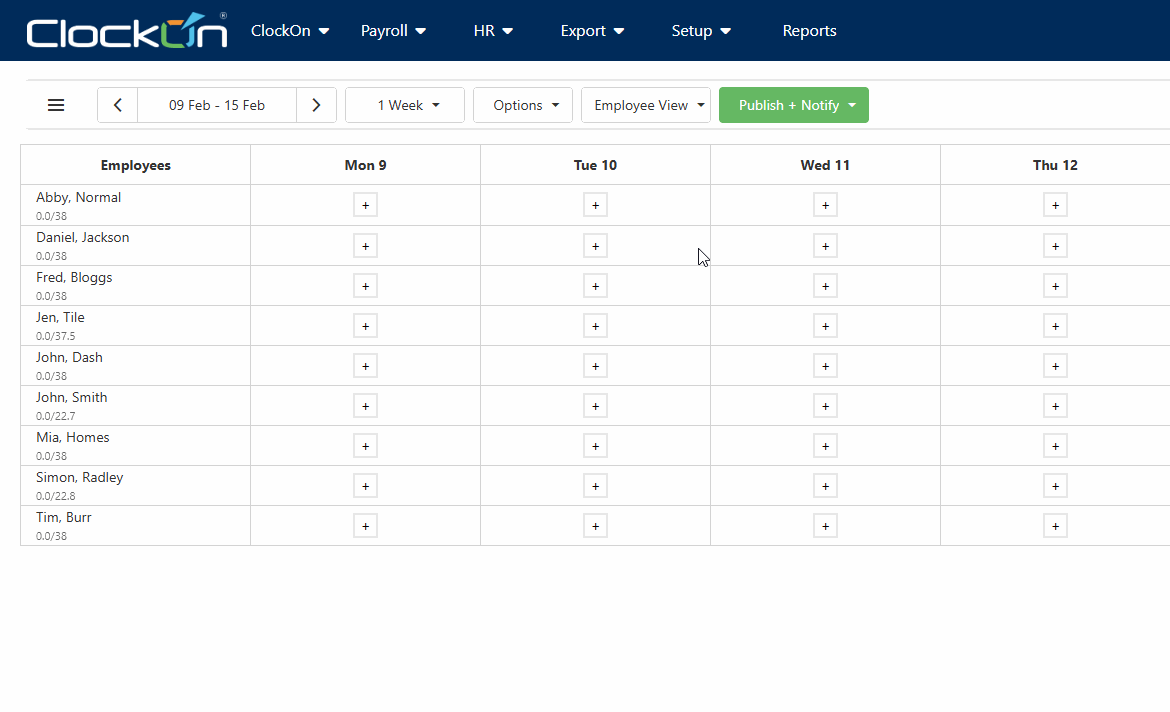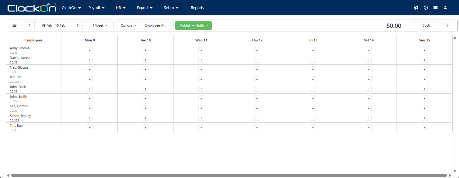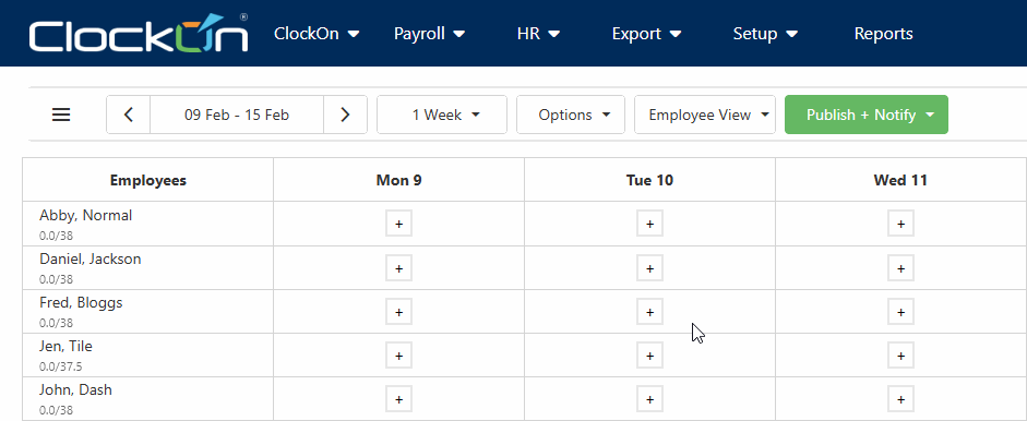 To add a timesheet to the roster screen, simply click the + for the employee and day.