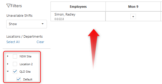 The location and department filter allows you to limit the listing of employees/roles to the employees that are set to be allowed to work within the selected departments.