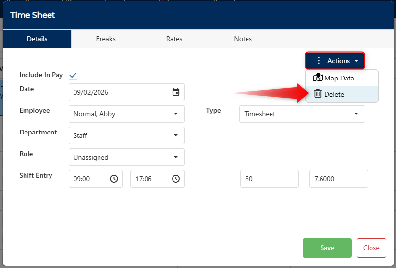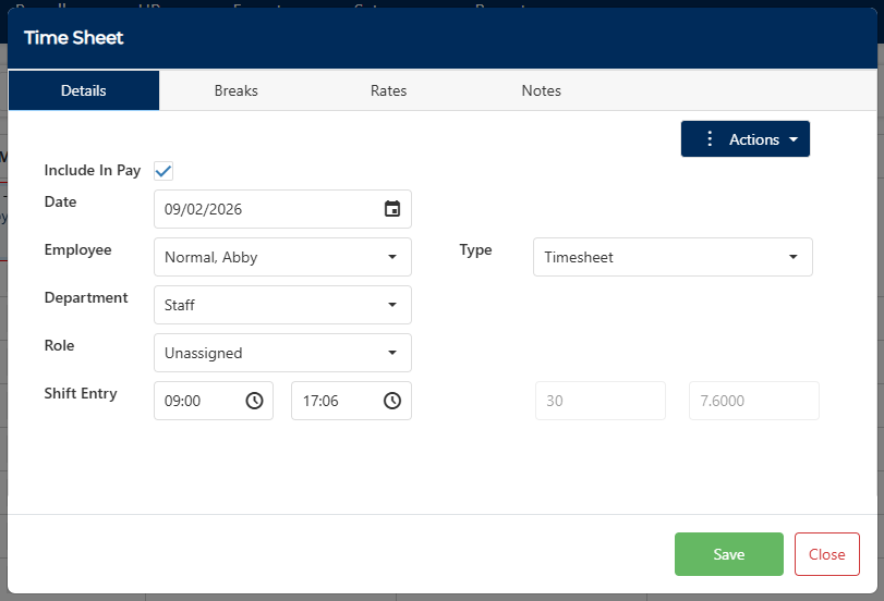 To edit the timesheet details, either double-click on the shift or right-click and select the Edit option, this will bring up the timesheet detail screen.