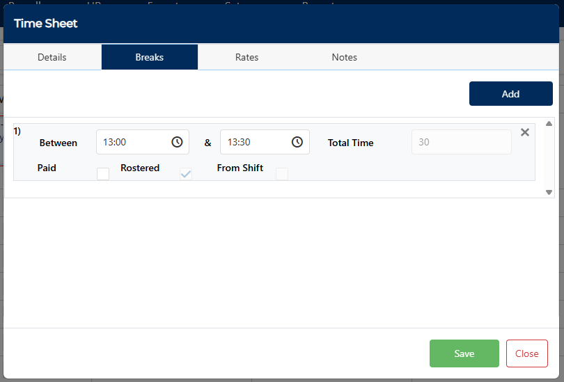 Using the Breaks tab you can set/see the rostered break times currently set against the shift.