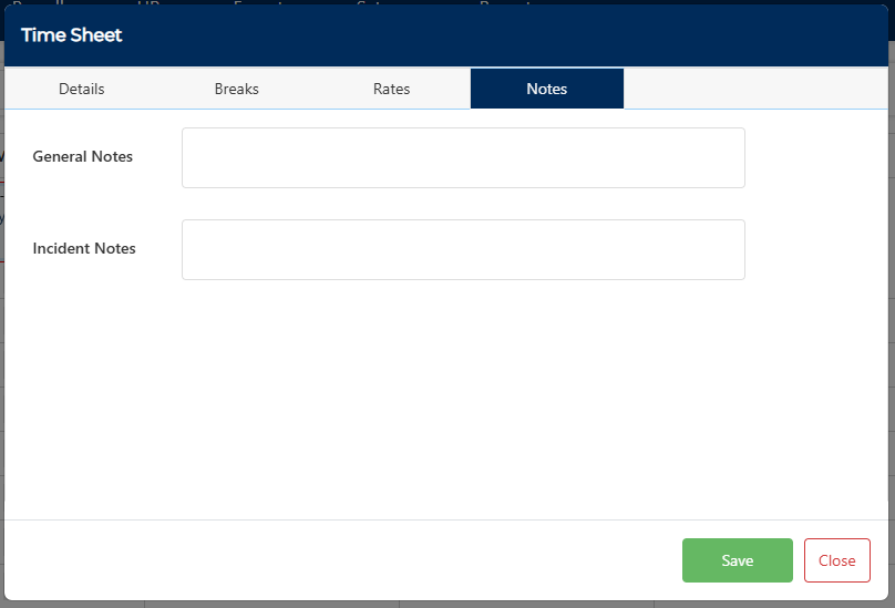 The Notes tab allows you to enter General notes (potentially visible to employees using self-service functionality), and incident notes (restricted to team members that have direct access to the rosters and time sheet screens).