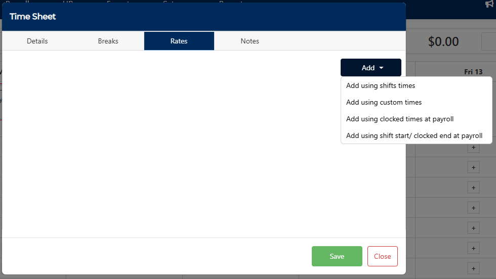 The Rates tab allows you to override the employee's base hourly rate for either the whole shift of a set period of time within the shift.