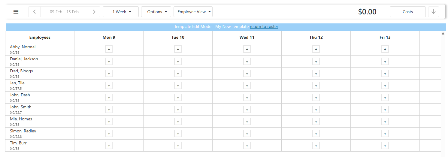 Options available in this mode are generally the same as the standard roster. From here you can add the template shifts.