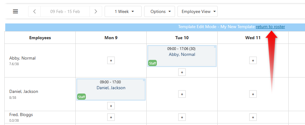 Once you have finished adding or making adjustments to the template shifts, click the return to roster link