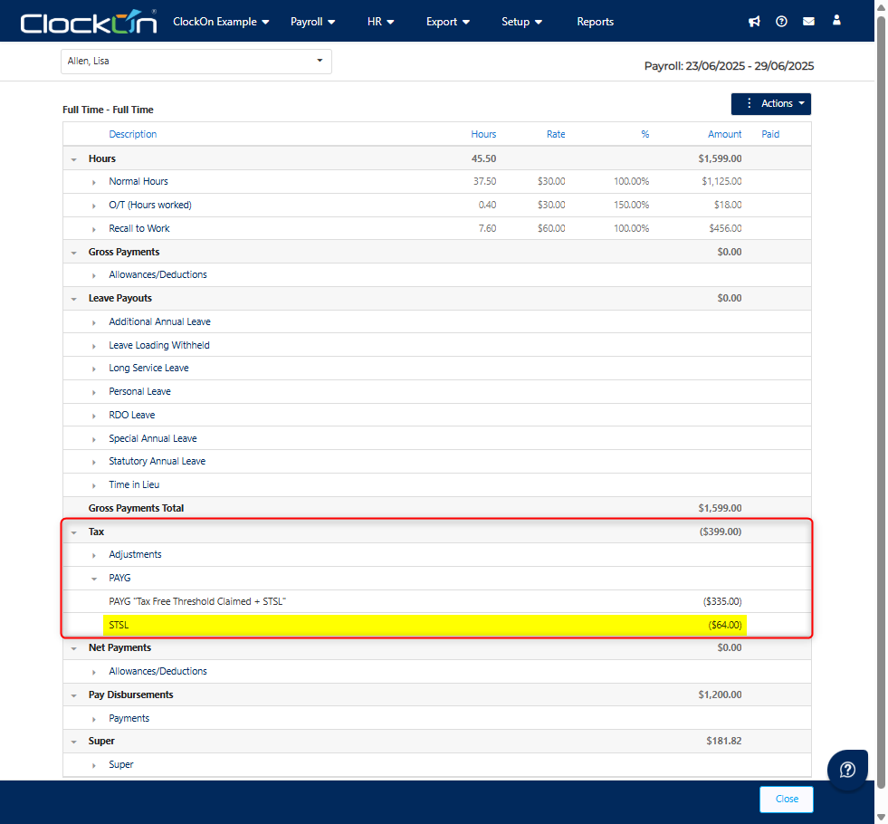If the employee meets the required threshold for repayments ClockOn will allocate more of the wage within the payroll to a separate line item under Tax > PAYG the section as STSL.